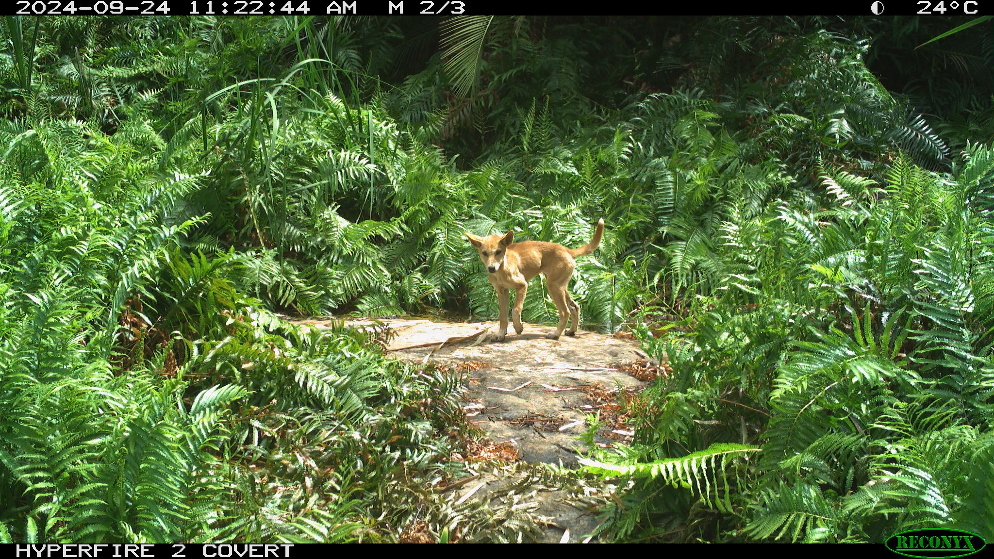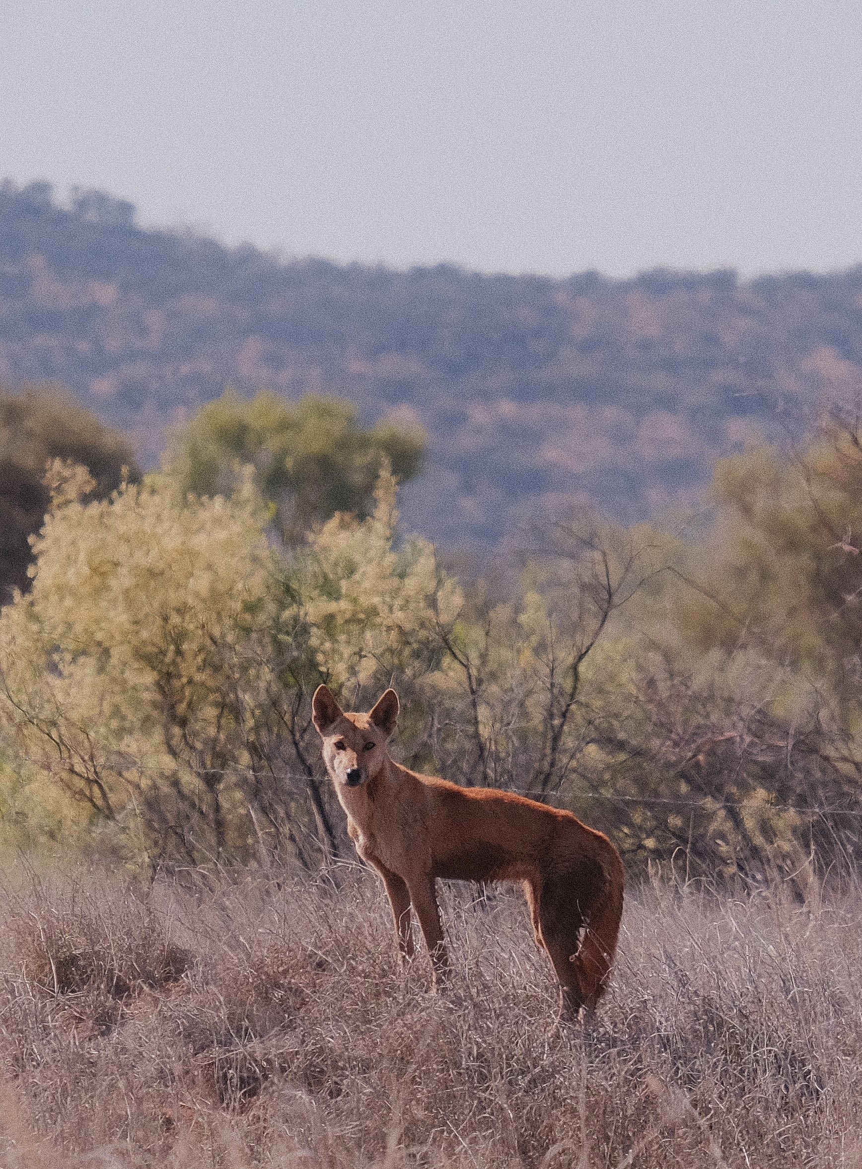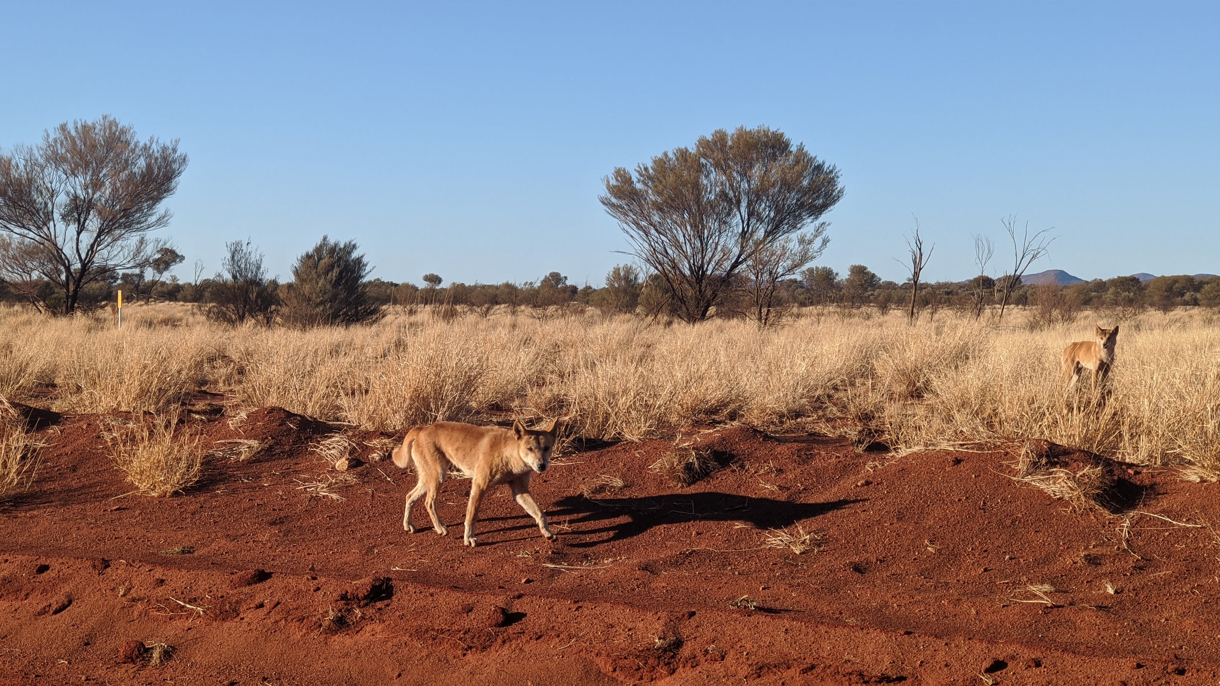 In this moment, a dingo appeared to the right of the road we were driving along. The dingo walked slowly onto a rocky rise in the Country and peacefully looked at us until we left.