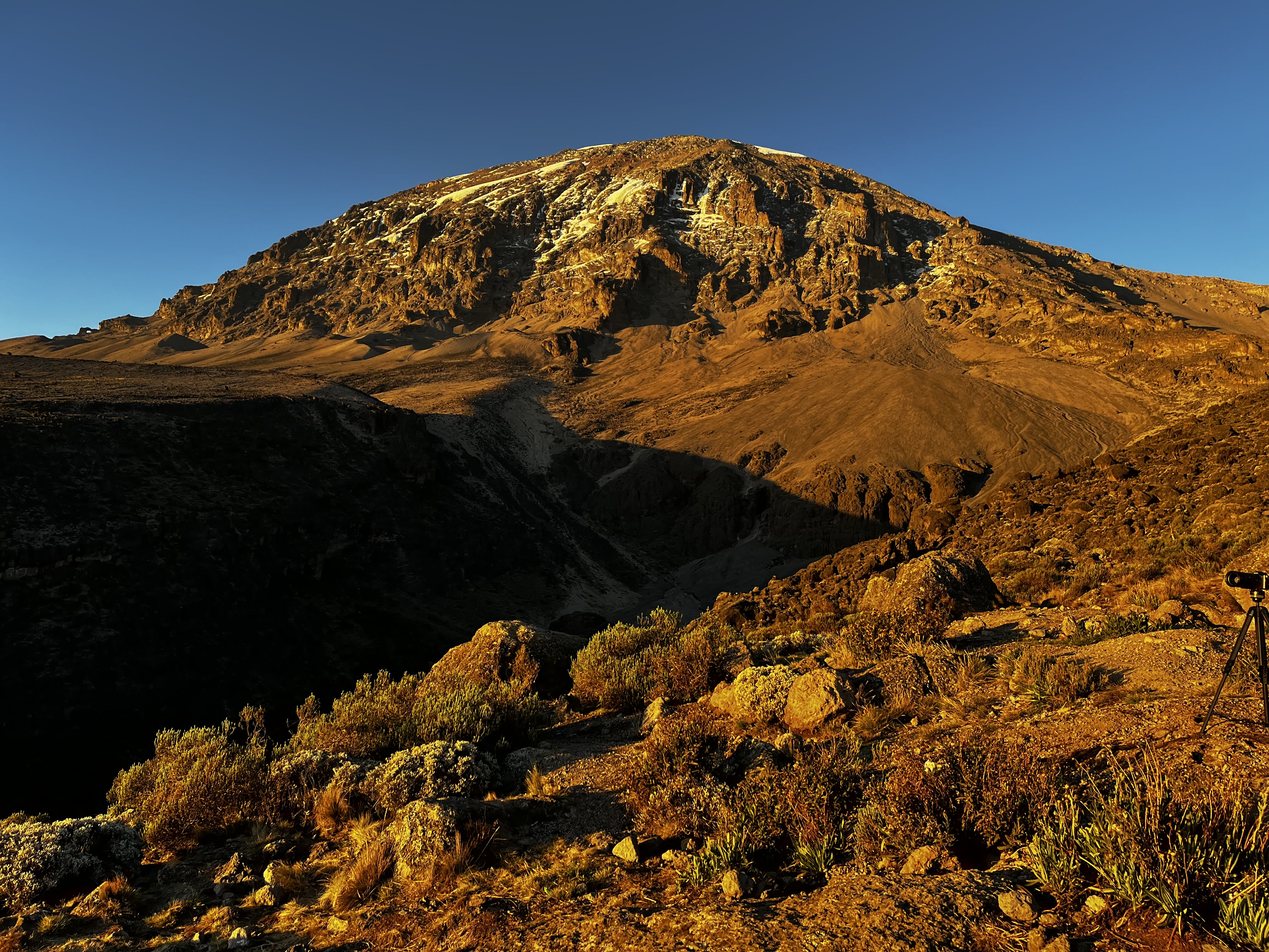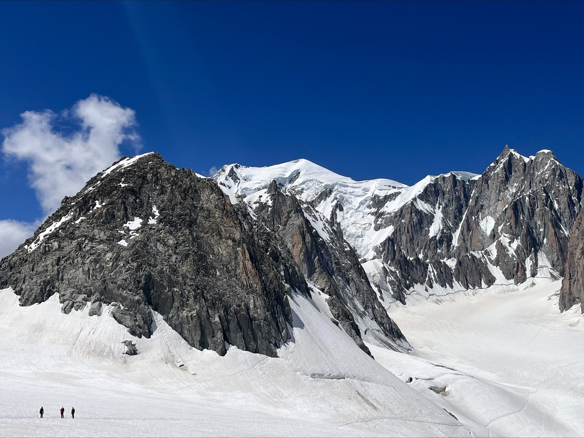 Mont Blanc is the highest peak in Western Europe at 4810m. This photo of Mont Blanc massif, with mountaineers in the foreground, was taken in June 2025 from the North-east at about 3300m elevation during an acclimatization traverse of La Vallée Blanche, from Aiguille du Midi in France to Torino Hut in Italy.