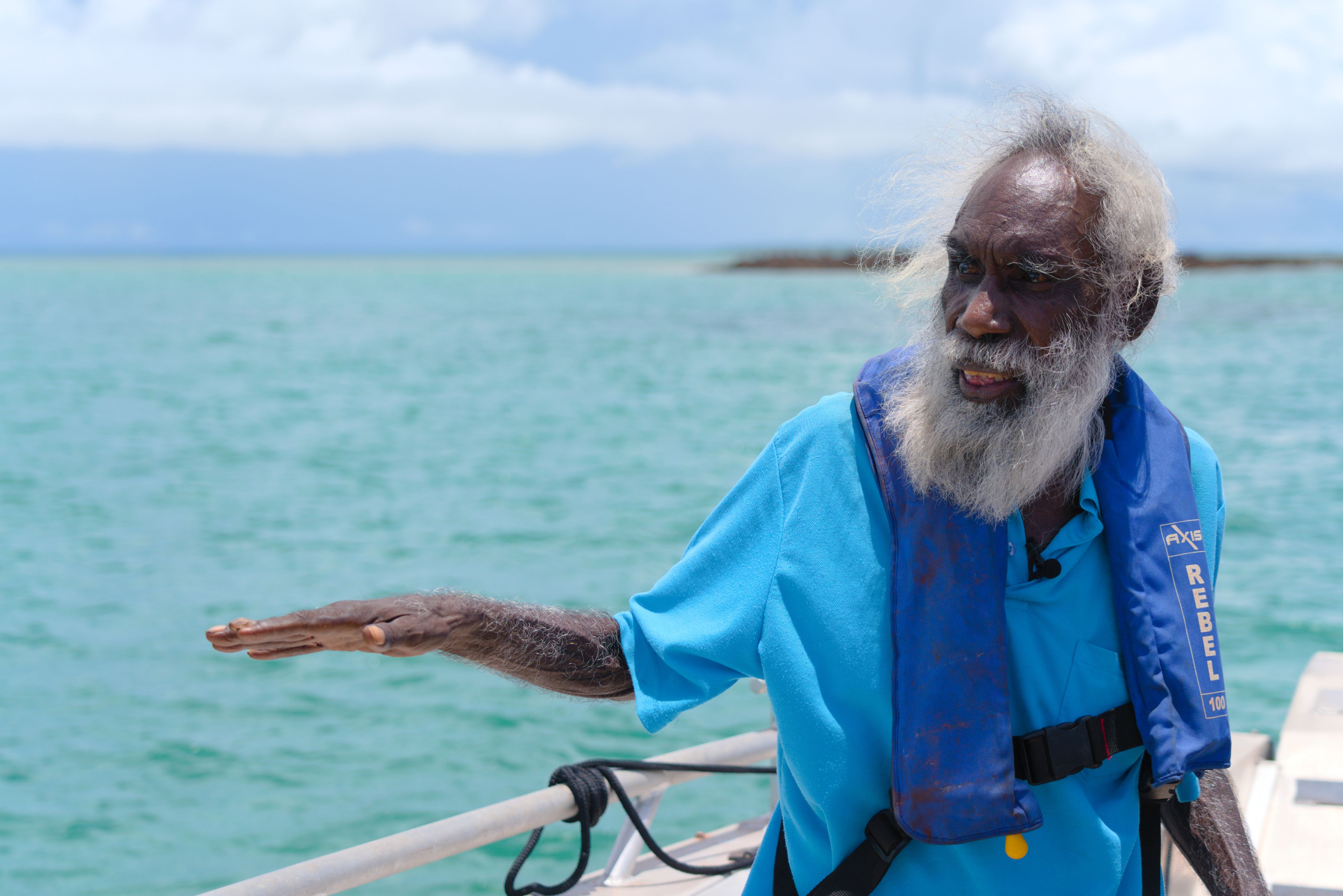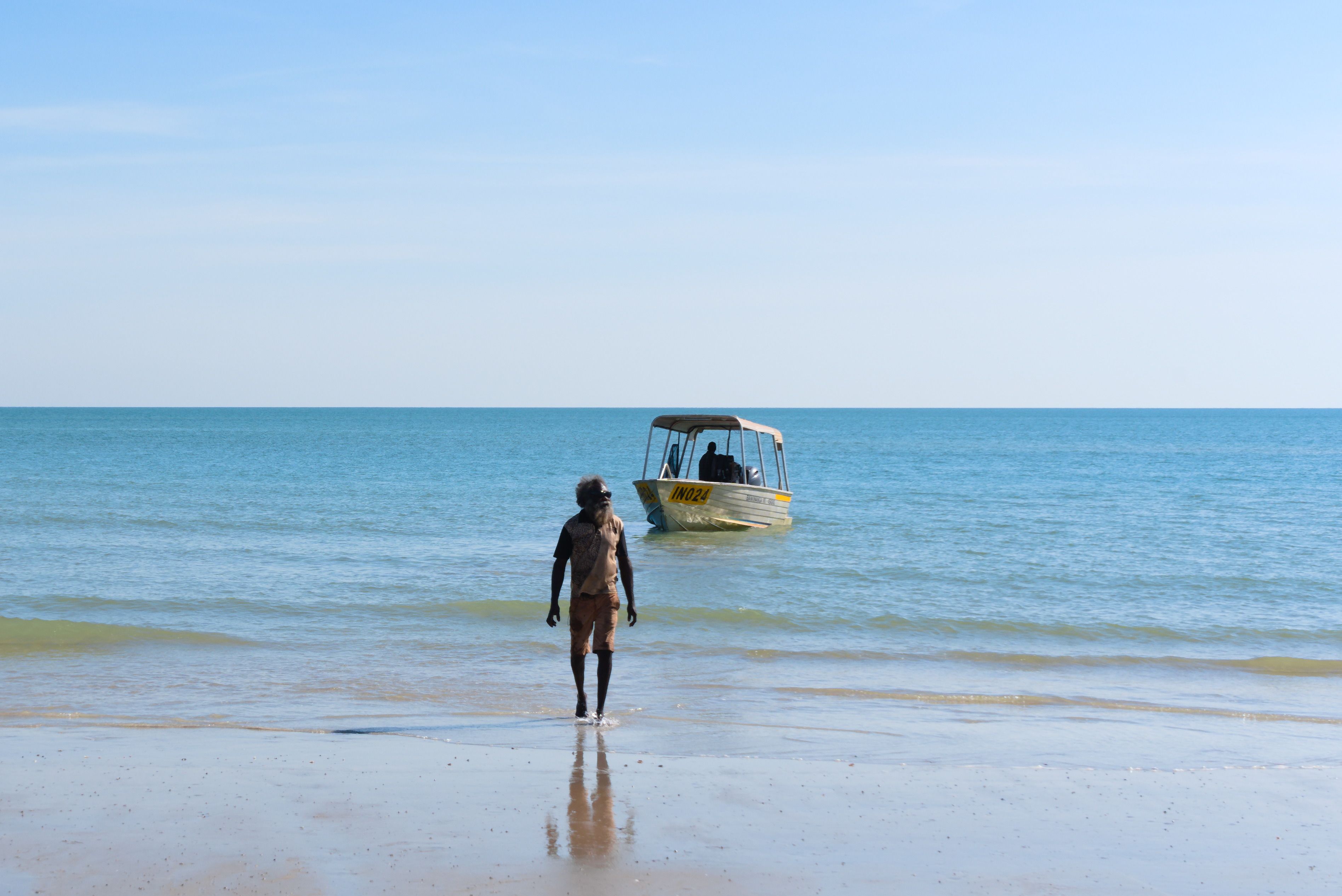 Saltwater elder Don Manjeridju Wilton surveys the waters he crossed by dugout canoe as a child. Born at Goulburn Island, Don returned by dugout to his father’s Country near Maningrida as a child and has been building the community ever since.