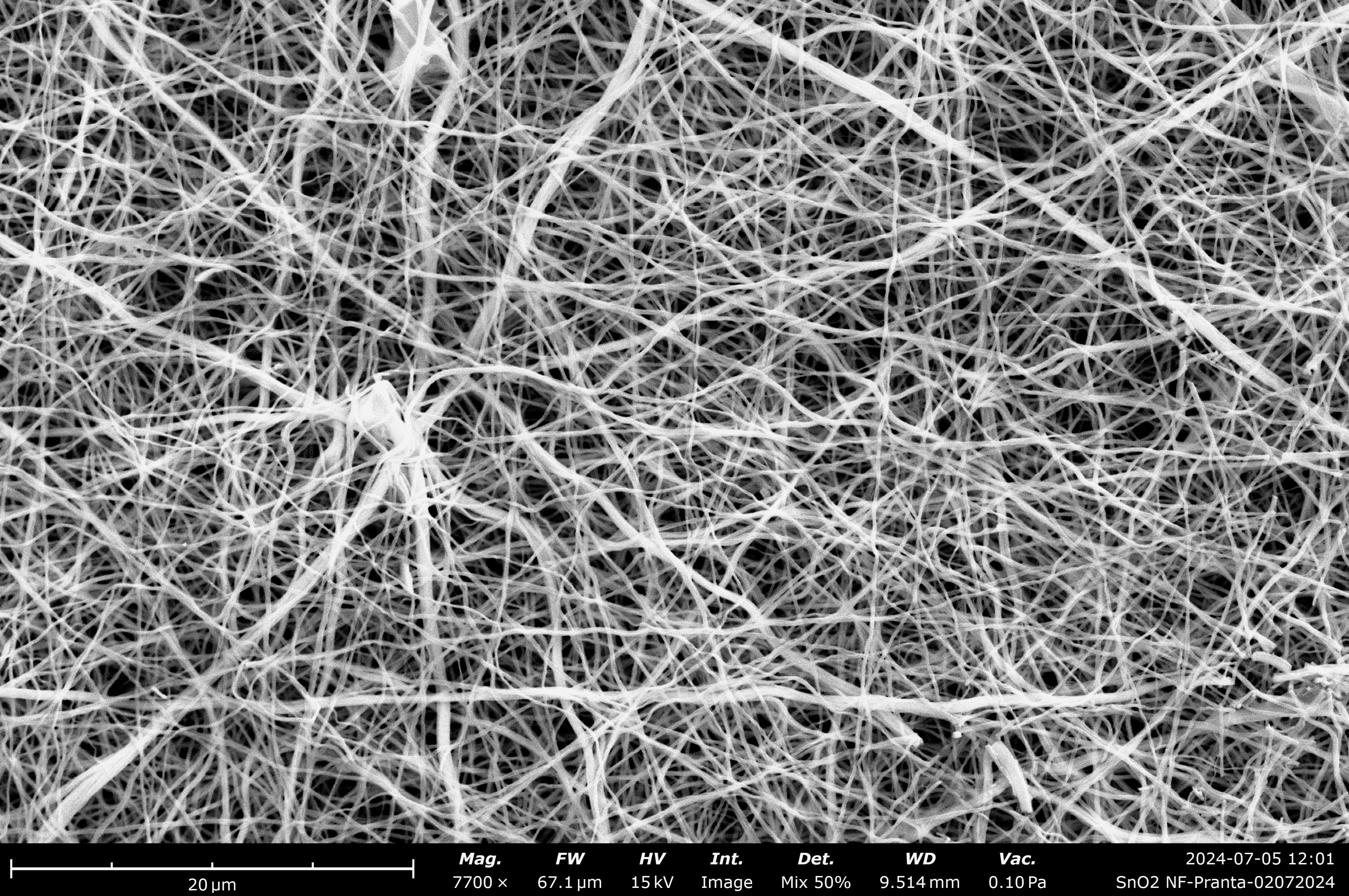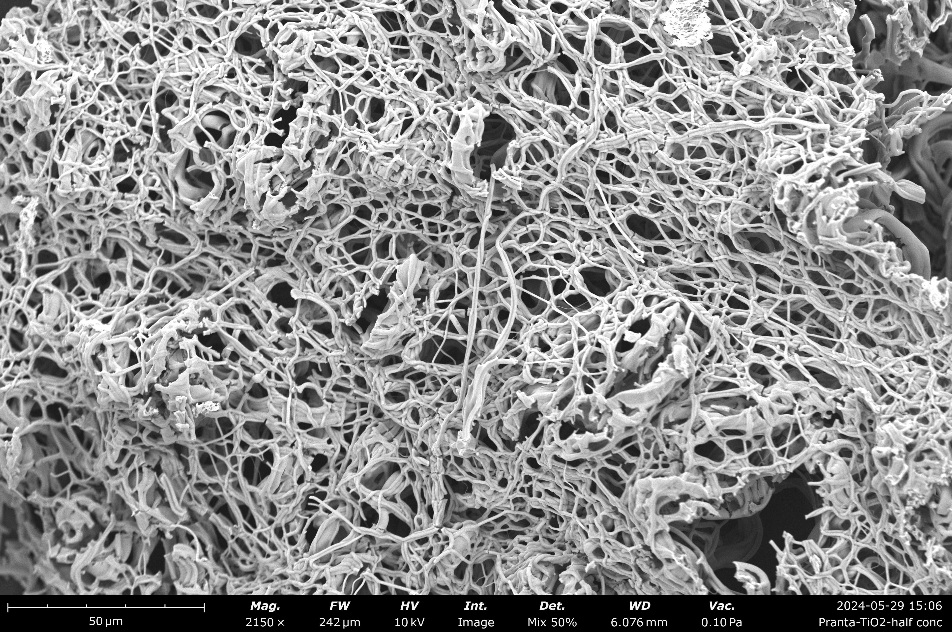 Seen through a Scanning Electron Microscope (SEM) — a powerful imaging tool that reveals structures far smaller than the eye can see — this image shows a delicate web of titanium dioxide (TiO2) nanofibers.