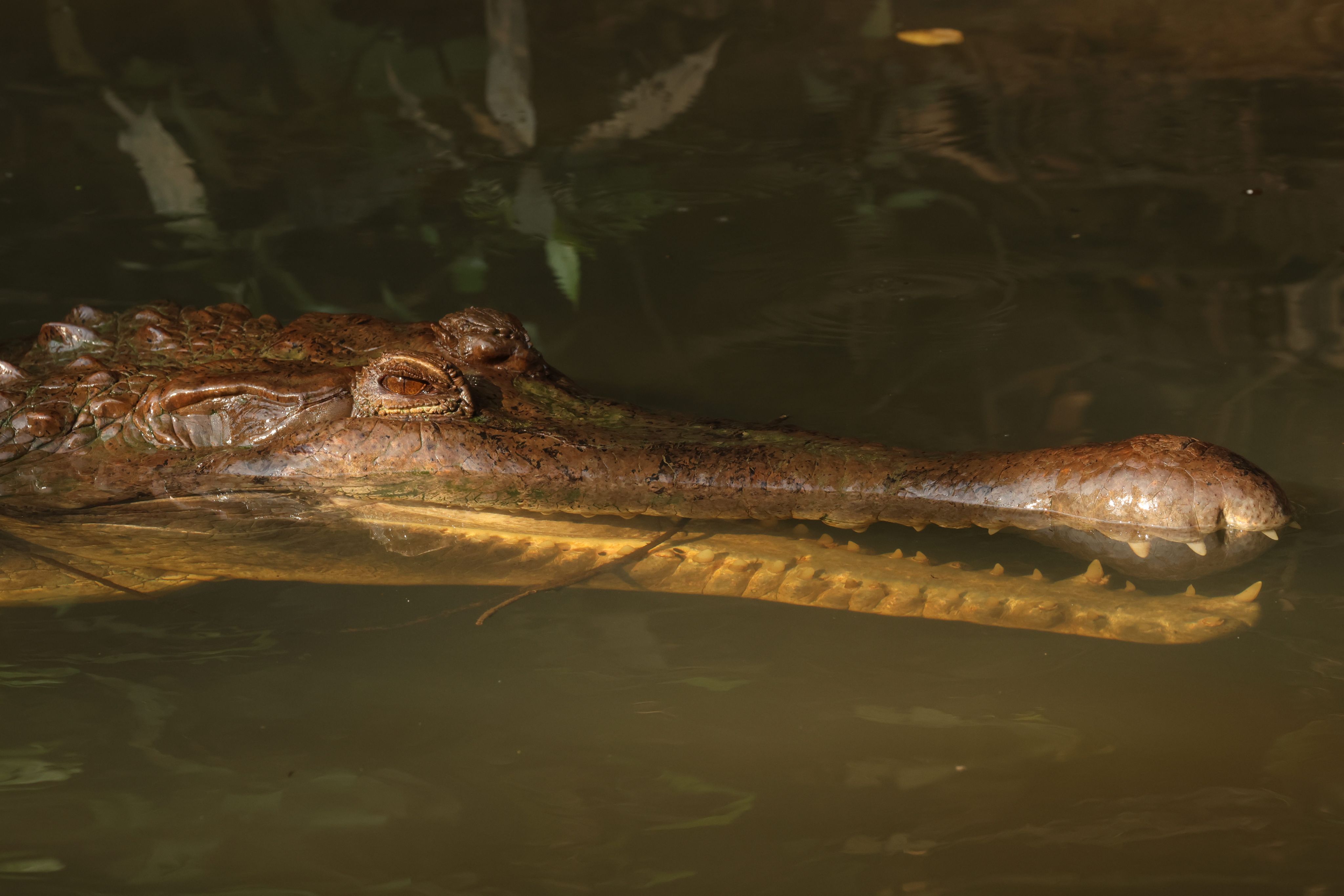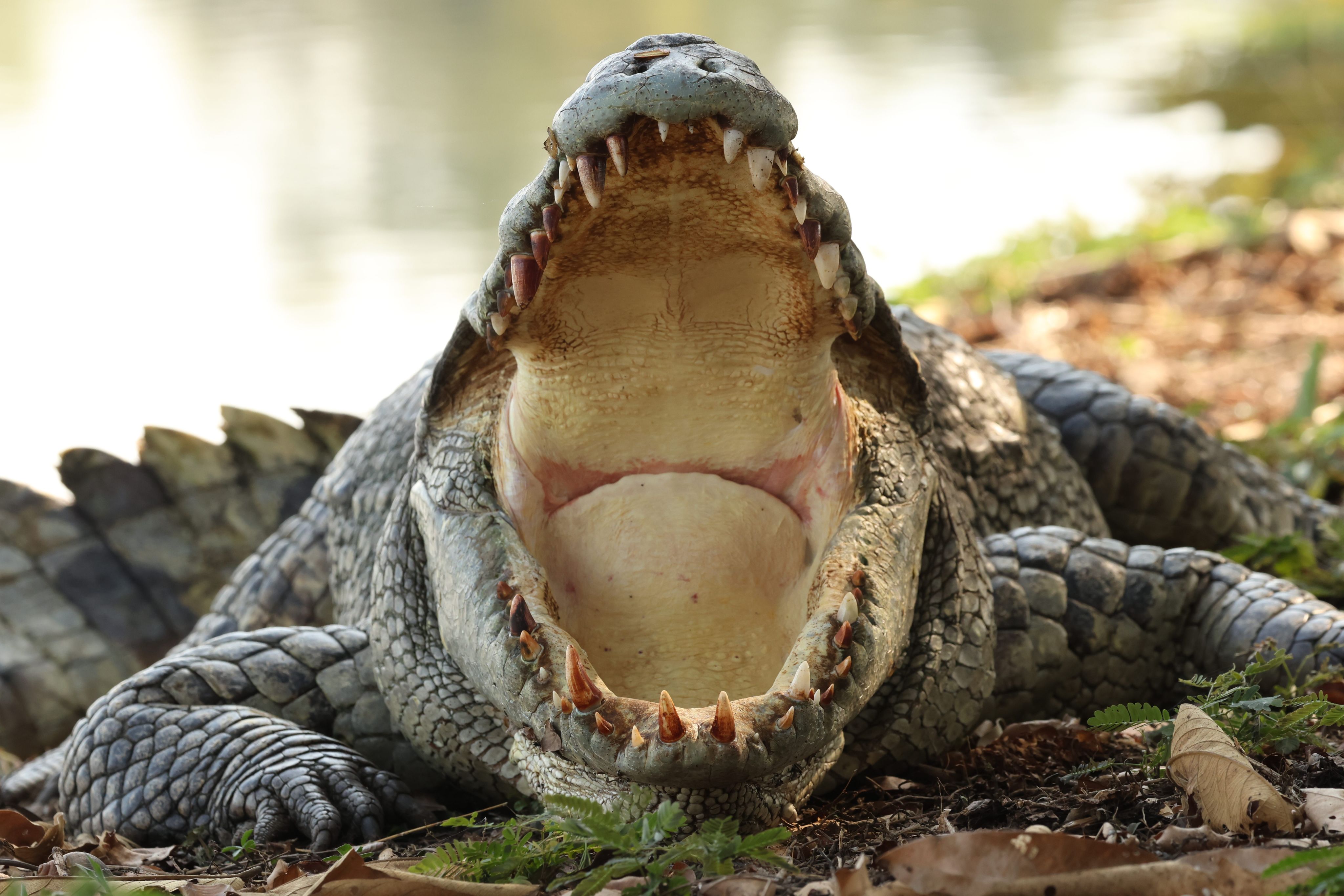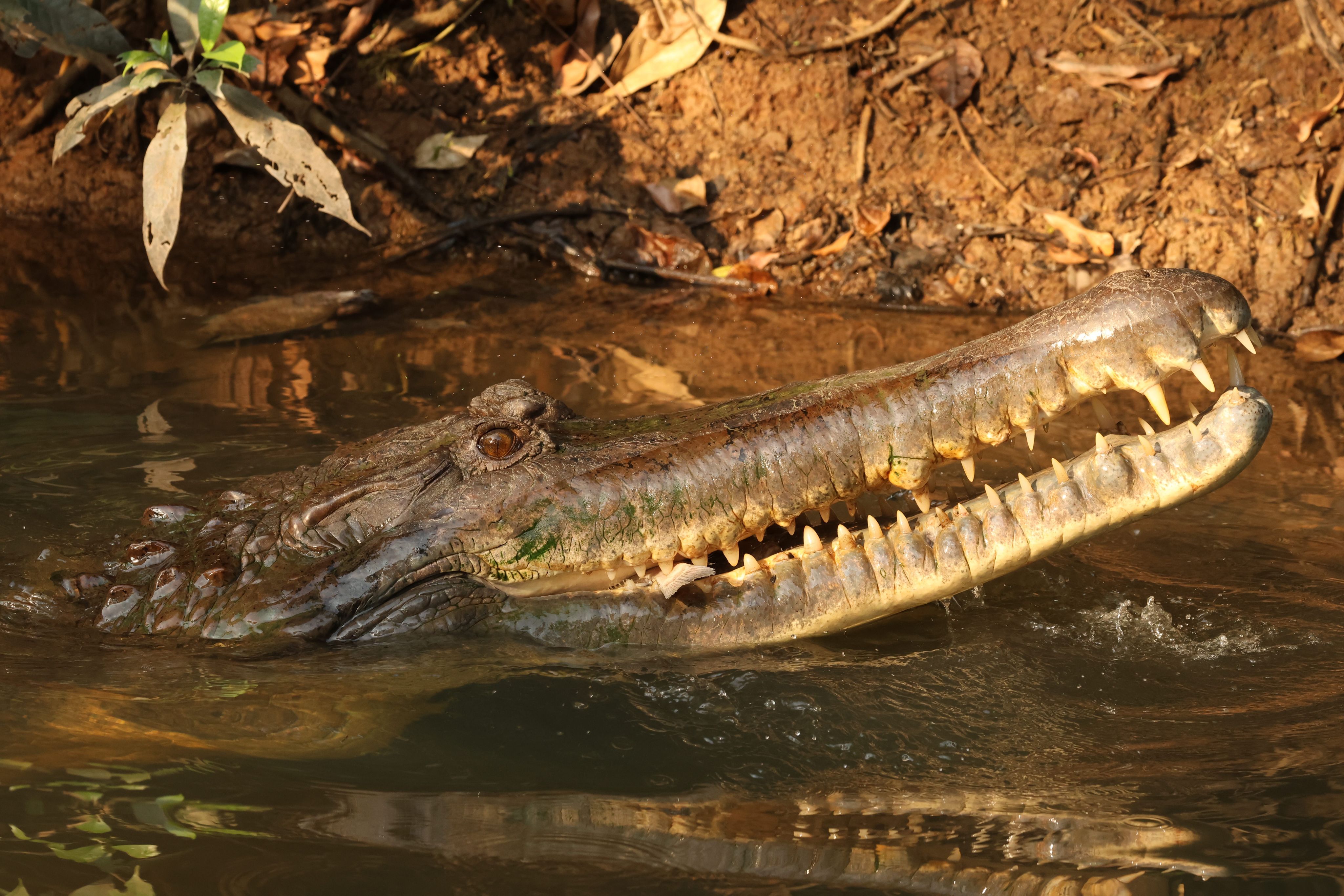 A critically endangered wild Siamese crocodile (Crocodylus siamensis) basking on the bank of Bueng Boraphet wetlands near Nakhon Sawan, Thailand.