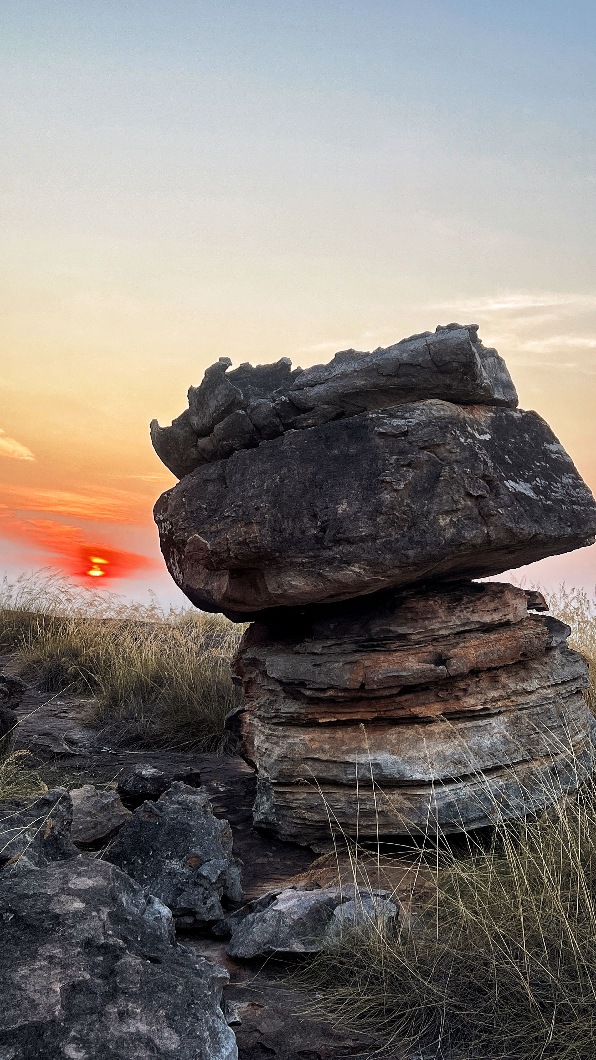 The sun is setting, its light drifting softly across the earth as a gentle breeze brings a touch of coolness. On the top of a quiet hill stand two solitary boulders. Despite billions of years of rain and sun, they maintain a delicate balance, standing firm and unmoving.